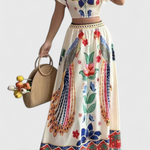 Descubre el Conjunto Itzel Nido de Abeja Estampado Étnico Selecto, una prenda ligera y alegre que irradia un estilo boho único. Este conjunto combina un top corto con nido de abeja y una falda fluida, perfecta para lucir en vacaciones o eventos culturales.