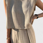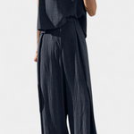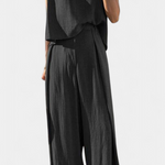 El top sin mangas presenta una silueta minimalista, ideal para combinar con diferentes accesorios. Los pantalones de pierna ancha ofrecen un look suelto y femenino, garantizando gran movilidad.