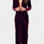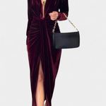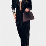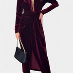 LaVerna Vestido Largo De Terciopelo Dorado Colección Privada es una pieza que irradia sensualidad y elegancia atemporal. Su diseño cuenta con un profundo cuello en V que estiliza la figura, mientras que las mangas largas aportan equilibrio y sofisticación.