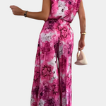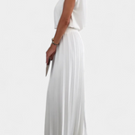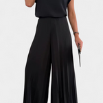 El top sin mangas presenta una espalda abierta y hombreras definidas, creando un efecto estructurado que realza la figura. Los pantalones plisados de pierna ancha aportan fluidez y movimiento, garantizando comodidad sin sacrificar la elegancia.