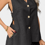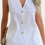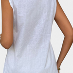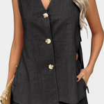 - Camisa sin mangas con escote en V y botones para un look estructurado y limpio.