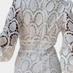 El vestido Lucinda es una pieza romántica y elegante que evoca un aire de cuento. Su diseño combina encaje calado con una silueta fluida, resaltando la feminidad etérea.