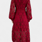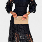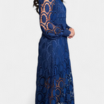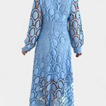 El intrincado encaje circular crea una delicada textura visual, mientras que la longitud midi equilibra la sofisticación y la comodidad estacional, convirtiéndolo en una opción versátil para fiestas en el jardín y bodas primaverales.