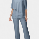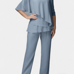 La Dinah Colección Conjunto Dos Piezas Silueta Exclusiva ofrece una elegancia suave con una estructura relajada. Este conjunto combina un top sin mangas con un escote amplio y un pantalón de tiro alto, creando una silueta refinada y cómoda.