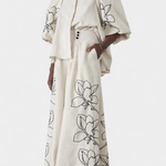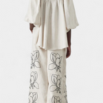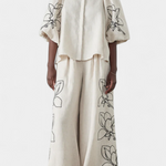 Relajado pero sofisticado, el conjunto Helen fusiona comodidad natural con un estilo elegante y actual. Su blusa de mangas globo y los pantalones de pierna ancha en mezcla de algodón y lino crean una silueta fluida y fresca, perfecta para los días cálidos.