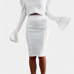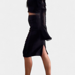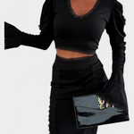Diseñado para destacar con feminidad y elegancia, el conjunto Minerva combina un top corto de manga larga con panel de encaje y una falda mini de cintura alta. Ideal para eventos, cenas o estilismos de oficina con un giro audaz, este look mezcla romanticismo y sofisticación con un ajuste favorecedor.