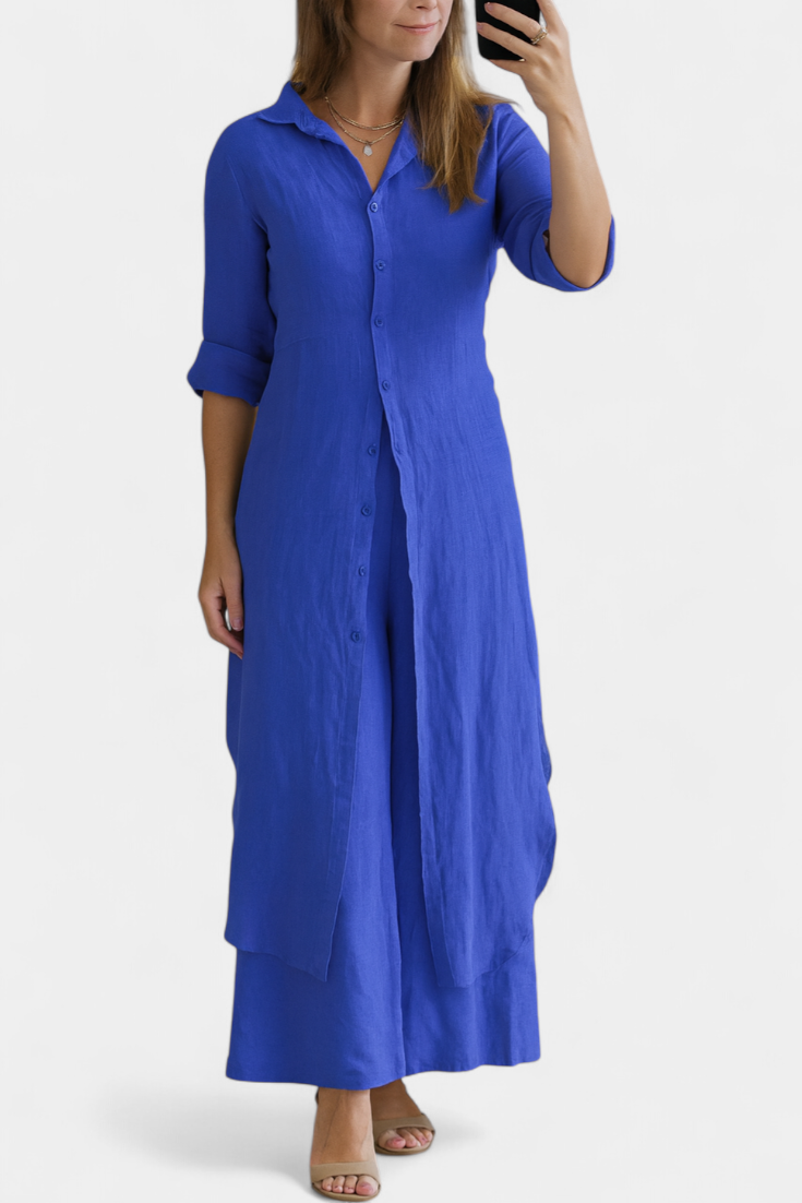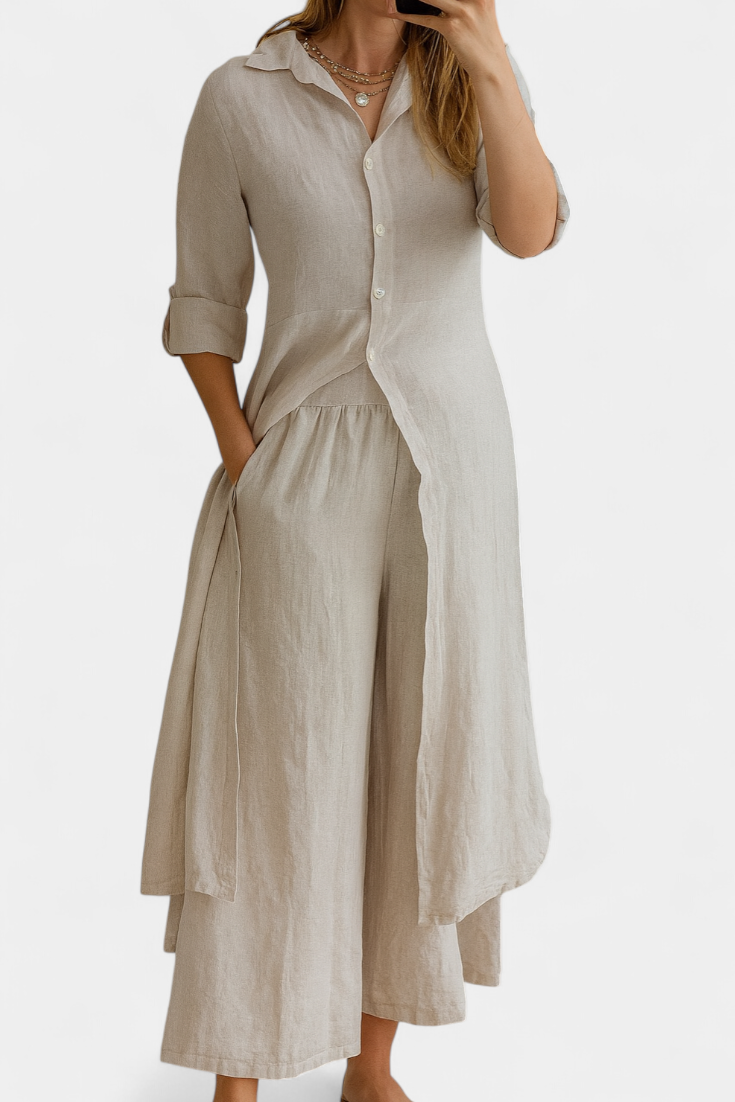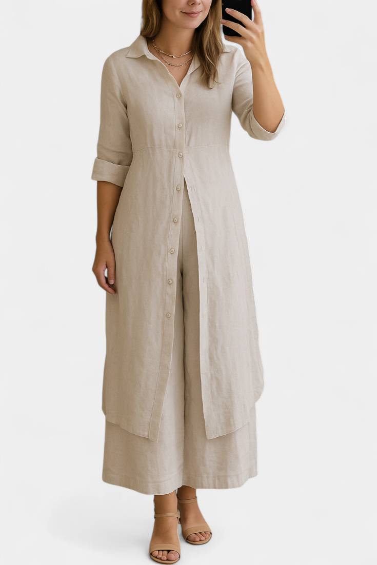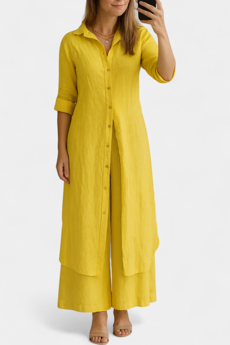 Ligero, natural y refinado, el conjunto Palmer celebra la elegancia relajada del lino puro. Este conjunto incluye un vestido camisero largo con cuello clásico y un pantalón suelto de corte fluido, ofreciendo un look completo que combina frescura y sofisticación en cada movimiento.