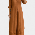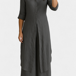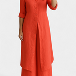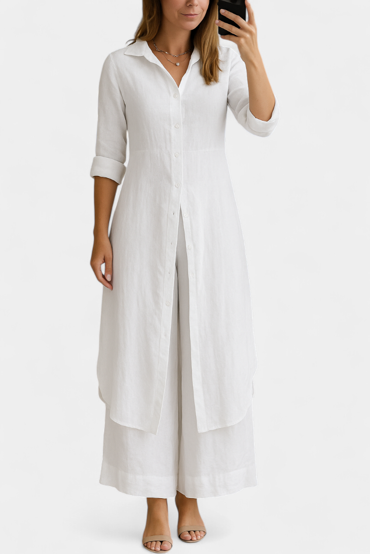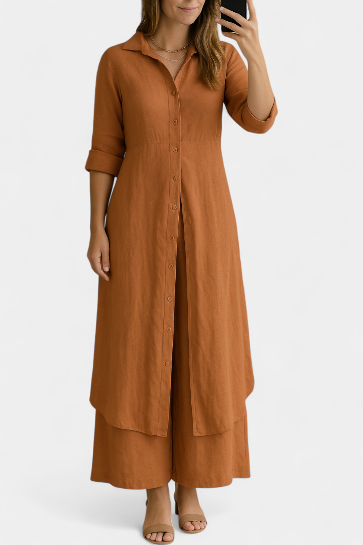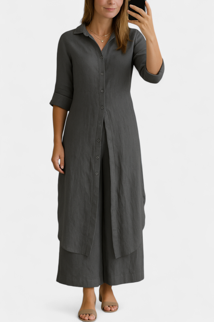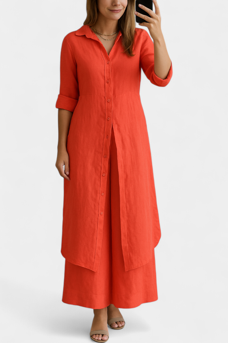 Ligero, natural y refinado, el conjunto Palmer celebra la elegancia relajada del lino puro. Este conjunto incluye un vestido camisero largo con cuello clásico y un pantalón suelto de corte fluido, ofreciendo un look completo que combina frescura y sofisticación en cada movimiento.