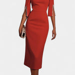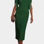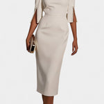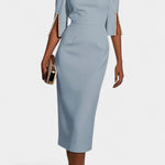 El Reece Vestido Midi Con Perlas Cuello Redondo Exclusivo es una pieza que combina elegancia y sofisticación. Su diseño clásico se realza con un cuello redondo atemporal y mangas a media altura, creando un equilibrio perfecto entre sobriedad y estilo.