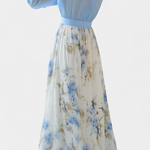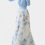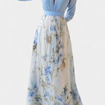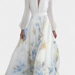 Elegancia etérea con un toque artístico y moderno. El vestido Eliane combina una parte superior fluida con escote en V profundo y mangas vaporosas, con una falda larga decorada en un delicado estampado floral tipo acuarela. Su movimiento envolvente y silueta refinada lo convierten en una pieza protagonista para brillar con naturalidad.