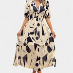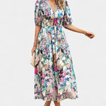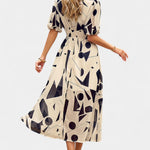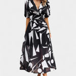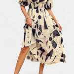 Con sus mangas abullonadas y una cintura fruncida que favorece, el vestido se adapta a diversas ocasiones, desde un brunch hasta paseos por el jardín. Su dobladillo asimétrico fluido añade un toque de elegancia.
