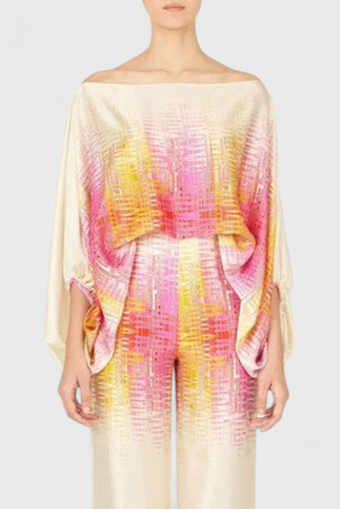 Descubre el conjunto Sybella, una fusión perfecta de estilo relajado y un toque romántico. Este conjunto de dos piezas incluye una blusa con hombros descubiertos y mangas de farol, combinada con pantalones de pierna ancha y un estampado artístico que resalta tu personalidad.