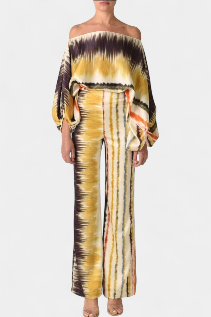 La blusa presenta mangas de farol que aportan un aire femenino y actual, mientras que los pantalones amplios ofrecen un ajuste holgado que permite libertad de movimiento. Su estampado artístico añade un toque de elegancia sin esfuerzo.