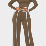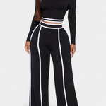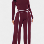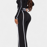 El pantalón de corte recto, adornado con franjas en contraste, alarga visualmente la figura, proyectando confianza y modernidad en cada ocasión.