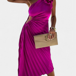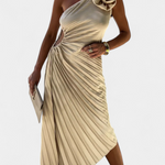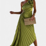 Elegancia contemporánea con un giro artístico. El vestido Leire redefine el estilo de cóctel con su silueta asimétrica de una sola manga y un delicado aplique floral en el hombro. La falda plisada fluye con movimiento refinado, creando una presencia cautivadora perfecta para celebraciones especiales.