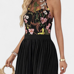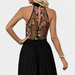 - Parte superior tipo halter con encaje floral semitransparente que realza el torso.