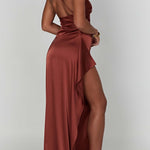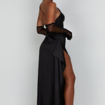 Su diseño asimétrico de un solo hombro, combinado con un drapeado sutil, aporta un aire sensual y sofisticado. La abertura pronunciada en el muslo añade movimiento y audacia, perfecto para noches especiales donde el impacto visual es imprescindible.