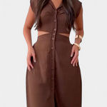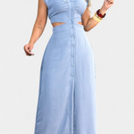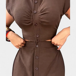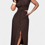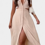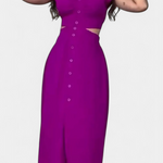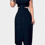 El vestido Griselda Midi Minimalista Cintura Abierta Exclusiva es audaz y favorecedor, diseñado para destacar. Su cintura abierta insinúa la piel, mientras que la botonadura central estiliza la silueta, convirtiéndolo en una opción perfecta para cualquier ocasión.