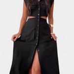 - Falda midi con abertura frontal que estiliza las piernas al caminar.