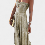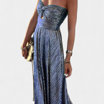 El vestido Onelia Sin Tirantes Metalizado Iridiscente es una pieza dramática y luminosa, diseñada para captar todas las miradas. Su tejido plisado iridiscente y su silueta estructurada lo convierten en la elección ideal para cualquier ocasión especial.