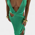 Con un escote en V profundo y tirantes de punto trenzado, este vestido realza la figura mientras ofrece comodidad. El cinturón de punto esculpido define la cintura, añadiendo un toque sutil de sofisticación.