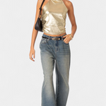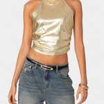 Audaz y sofisticado, el Anna Top Halter Metálico Karter de la Colección Exclusiva es una declaración de estilo. Con un acabado brillante que capta la luz desde todos los ángulos, este top abraza la figura con un ajuste ceñido y elegante.