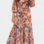 Feminidad relajada con un toque refinado. El vestido Aísha combina un estampado de hojas con una silueta ligera y elegante que realza con naturalidad. Su escote en V, mangas amplias y cintura definida lo convierten en la elección perfecta para sentirte especial sin esfuerzo, ya sea en eventos formales o días soleados con estilo.