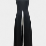 Minimalismo refinado con un giro sofisticado. El conjunto Alicia presenta una silueta sin mangas de cuello redondo y una sobrecapa fluida tipo vestido que se abre al frente para revelar pantalones anchos en contraste. Una opción moderna y chic para destacar con distinción.