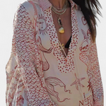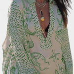 - Camisa fluida con escote en V, cordones y estampado artístico.
