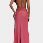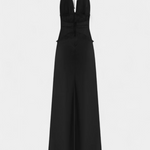 - Escote halter profundo que estiliza y realza el busto con elegancia.