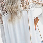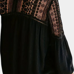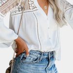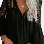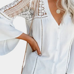 Confeccionada en una suave mezcla de algodón y rayón, su escote en V favorece la figura, mientras que las mangas acampanadas añaden un toque de fluidez. Los detalles de encaje calado intrincados realzan su diseño, convirtiéndola en una opción perfecta para cualquier ocasión.