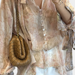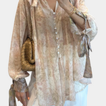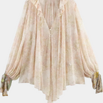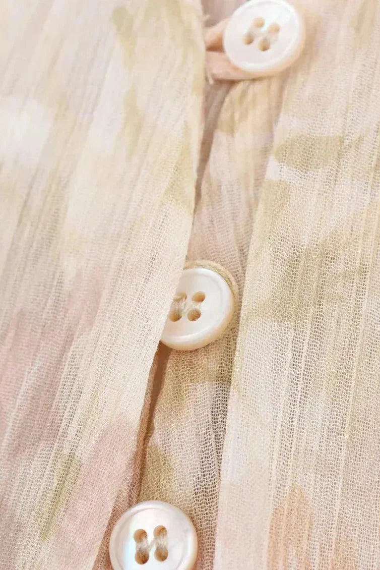 Con un estampado de tonos pastel de ensueño, la blusa destaca por sus mangas con lazo romántico. Los delicados botones de nácar añaden un toque de elegancia y sofisticación.