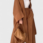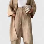 Relajación sofisticada en su forma más pura. El conjunto Caspian ofrece una silueta amplia y fluida compuesta por un pantalón de pierna ancha y una capa tipo kimono. Su tejido ligero con textura arrugada aporta un aire relajado pero pulido, ideal para climas cálidos y momentos de calma con estilo.