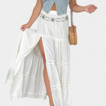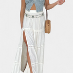 La falda Dalia Maxi Boho es un susurro de romance en cada pliegue. Su diseño de volantes y encaje evoca la suavidad de un atardecer, mientras que la abertura frontal invita a la libertad de movimiento, como un baile en un día cálido.