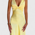 Refinado, moderno y con impacto visual, el vestido Dolores eleva tu estilo con un diseño que abraza la figura y realza tu presencia. Su escote en V profundo, la cintura retorcida y el drapeado suave lo convierten en una opción sofisticada para eventos especiales y noches memorables.