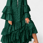 Con capas ligeras, elegantes plisados y volantes que realzan la feminidad, este vestido transforma momentos ordinarios en memorables. Las mangas acampanadas equilibran comodidad y estilo, creando un look encantador y lleno de personalidad.