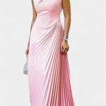 Con un diseño plisado asimétrico y una cintura alta, este vestido estiliza y define la silueta. El cuello mock añade un acabado contemporáneo, ideal para cualquier ocasión.