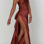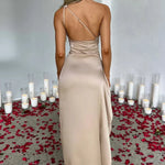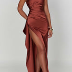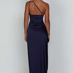 Su diseño asimétrico de un solo hombro, combinado con un drapeado sutil, aporta un aire sensual y sofisticado. La abertura pronunciada en el muslo añade movimiento y audacia, perfecto para noches especiales donde el impacto visual es imprescindible.