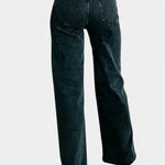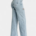 El denim azul índigo, acariciado por un lavado desgastado, se adorna con delicados rhinestones, como estrellas brillando en la noche. Su corte recto y relajado te envuelve en un abrazo de comodidad, mientras que los detalles desgastados añaden un toque de misterio y seducción.