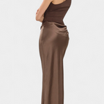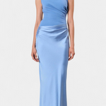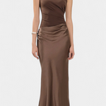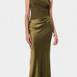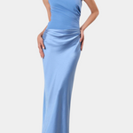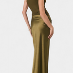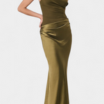 El escote de un solo hombro añade un toque de asimetría, mientras que los pliegues fluidos caen con gracia, esculpiendo una silueta imponente. Este vestido largo estiliza la figura con un corte que combina comodidad y estilo.