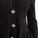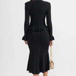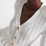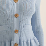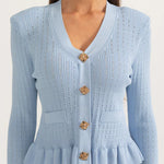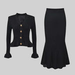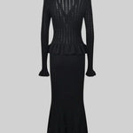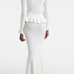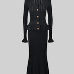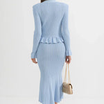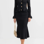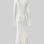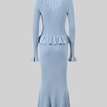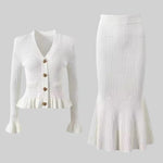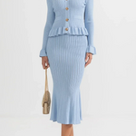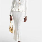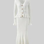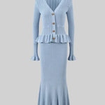 El conjunto Prudence Conjunto Punto Refinado Cárdigan Falda Midi es la fusión perfecta de sofisticación y versatilidad. Este conjunto incluye un cárdigan ajustado con escote en V, que destaca por sus delicados puños con volantes y botones de inspiración vintage.