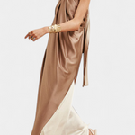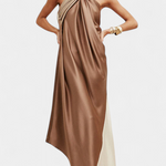 El vestido Rebecca Maxi Irregular Color Block Exclusivo combina sensualidad y modernidad en un diseño cautivador. Su corte halter estiliza los hombros, mientras que la espalda completamente abierta añade un toque atrevido y refinado.