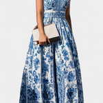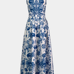 El vestido Shante celebra la elegancia clásica con un aire relajado y moderno. Su silueta A-line sin mangas, el estampado floral tipo porcelana y el detalle de solapa crean una pieza que fluye con gracia y deja una impresión refinada.