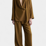 Los pantalones a juego completan un conjunto cohesivo, mientras que el tejido de viscosa premium asegura caída y comodidad. Su corte fluido y moderno estiliza la figura con naturalidad, haciendo de este conjunto una elección versátil.