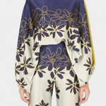 • La blusa presenta hombros caídos y mangas abullonadas, aportando un aire femenino y actual.