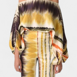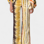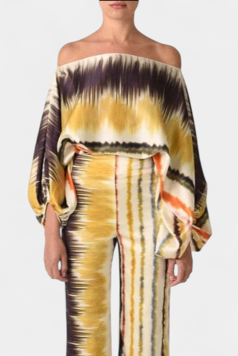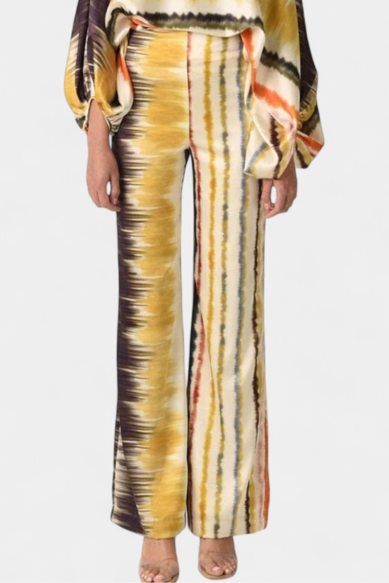 La blusa presenta mangas de farol que aportan un aire femenino y actual, mientras que los pantalones amplios ofrecen un ajuste holgado que permite libertad de movimiento. Su estampado artístico añade un toque de elegancia sin esfuerzo.