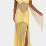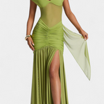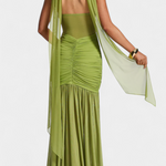 • El fruncido delantero define la figura con elegancia natural, mientras que la espalda baja en V añade un aire de misterio.