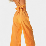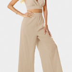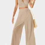 Los pantalones anchos de tiro alto complementan perfectamente el conjunto, ofreciendo una caída fluida y bolsillos discretos para mayor confort. Con un escote en V y tirantes finos, realza la figura de manera romántica.