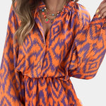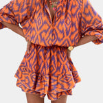 El mono Yasmine es la fusión perfecta entre alegría y funcionalidad. Con su estampado ikat en vibrantes tonos naranja y morado, este diseño mini destaca por sus volantes en capas y una silueta relajada que se adapta a cualquier ocasión.